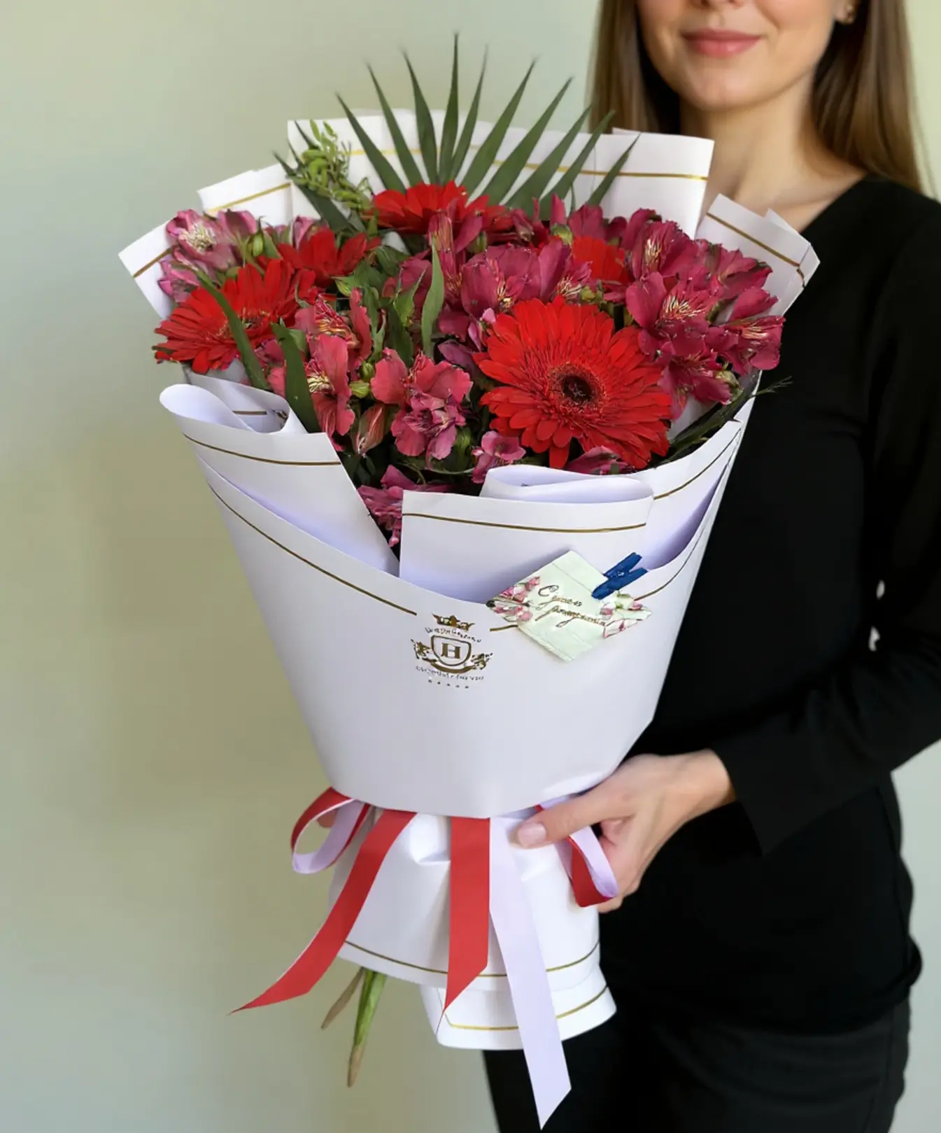 Этот букет словно сцена страстного танца: ярко-красные герберы задают ритм, а малиновые и бордовые альстромерии дополняют композицию нежностью и грацией. Акценты из зелени придают объём и свежесть, а стильная упаковка с красно-белыми лентами завершает образ.